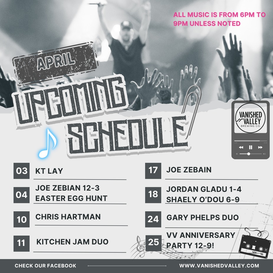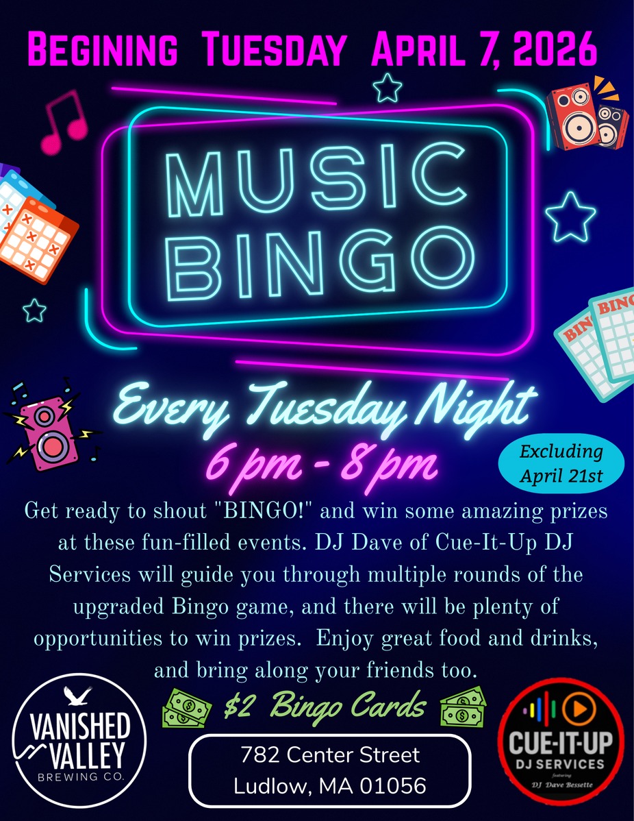 Come join the fun! Starting Tuesday April 7th, Vanished Valley is teaming up with Cue-It-Up DJ Services to provide an evening of music and fun, where music hits, joins the bingo scene. Come play 4 rounds of Music Bingo, enjoy great food and drinks, and have a chance to win some good prizes too. Bingo begins at 6pm, come early to get a good seat and get your bingo cards. *No Bingo on Tuesday, April 21st.