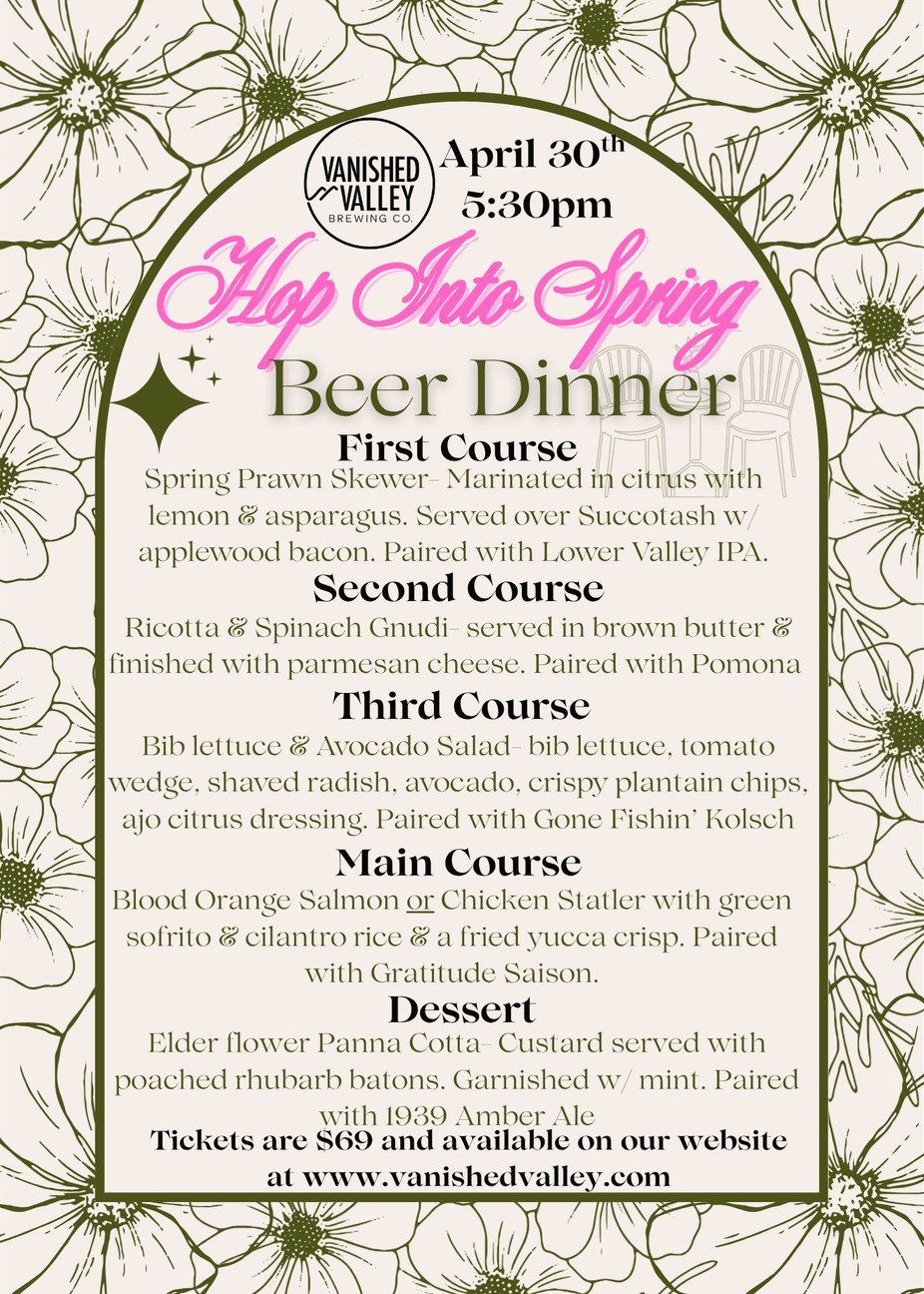 Thursday, April 30 at 5:30. Tickets are $69 each and include tax, gratuity and a five-course meal with beers.