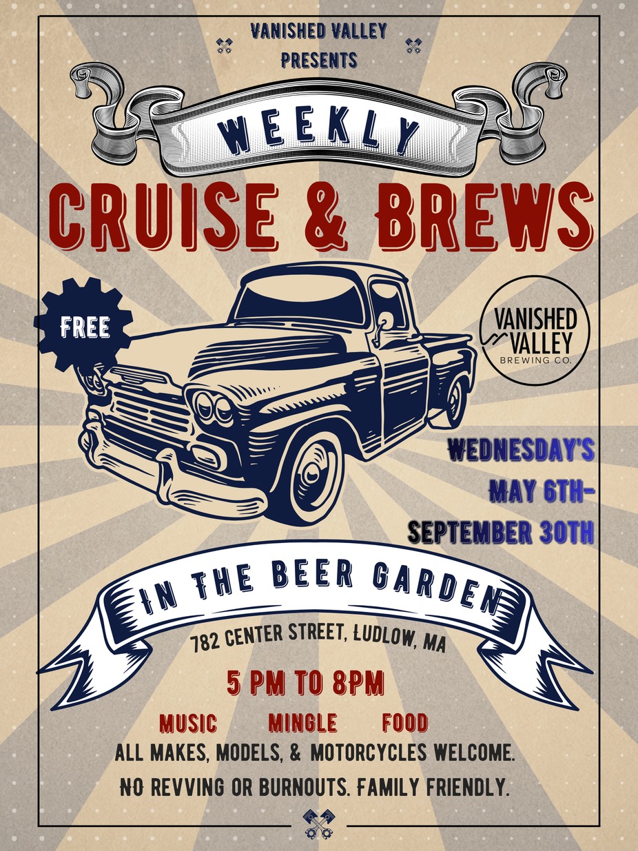 Cruise into Wednesdays with us! Join us every week for Cruise & Brews at Vanished Valley Brewing Co.! From May 6th through September 30th, we’re bringing together great cars, cold brews, and good vibes in the beer garden every Wednesday from 5PM–8PM. What to expect: • Music • Delicious food & drinks from Vanished Valley • A great lineup of cars & motorcycles (all makes & models are welcome!) • A fun, family & dog-friendly atmosphere Please note: No revving or burnouts — let’s keep it safe and enjoyable for everyone! Rain? We’ll cancel for the evening, so keep an eye out for updates. Plus, themed nights are coming soon… stay tuned! Grab your crew, bring your ride, and make Wednesdays your new favorite night of the week. See you there!Starting on Wednesday May 6th 2026